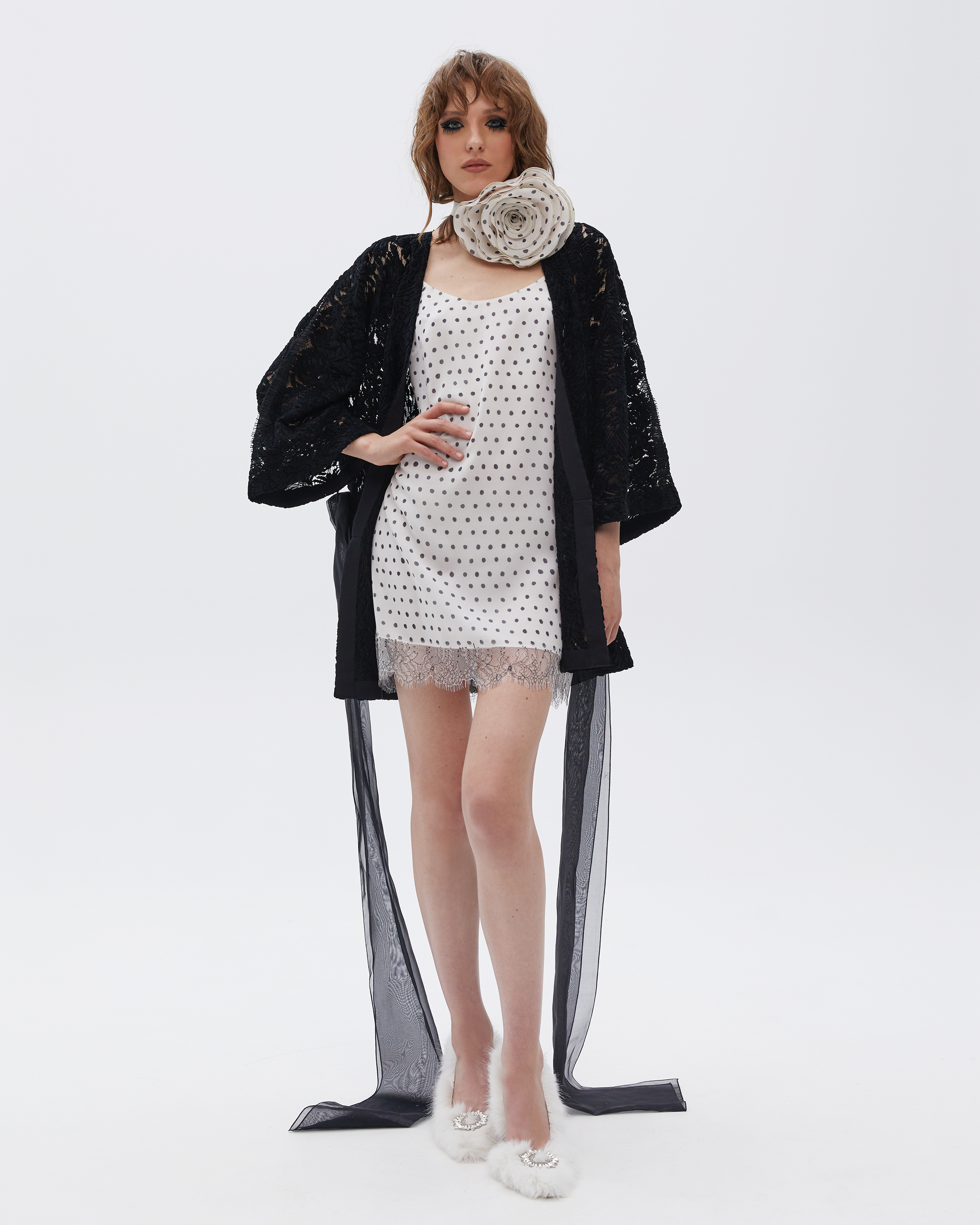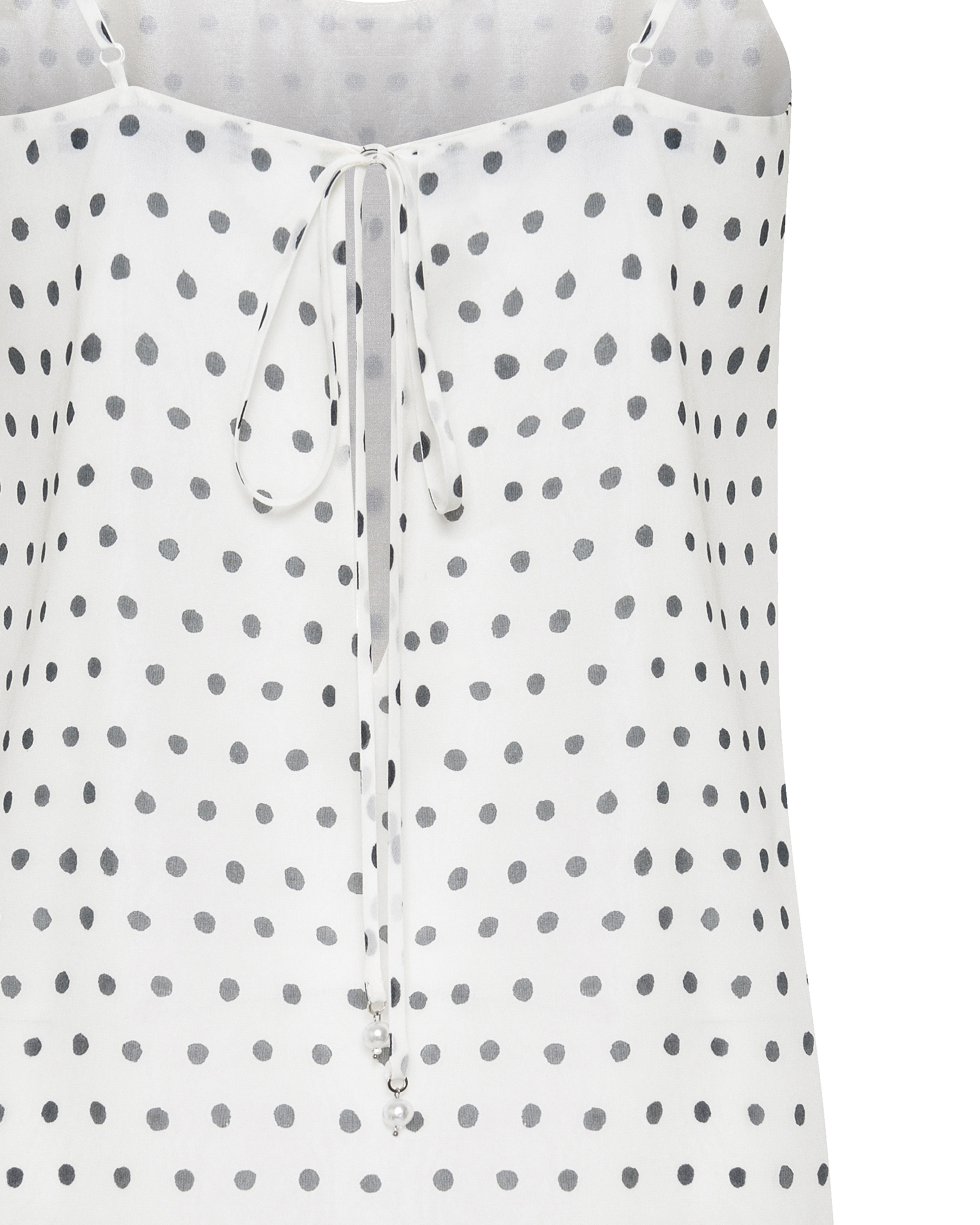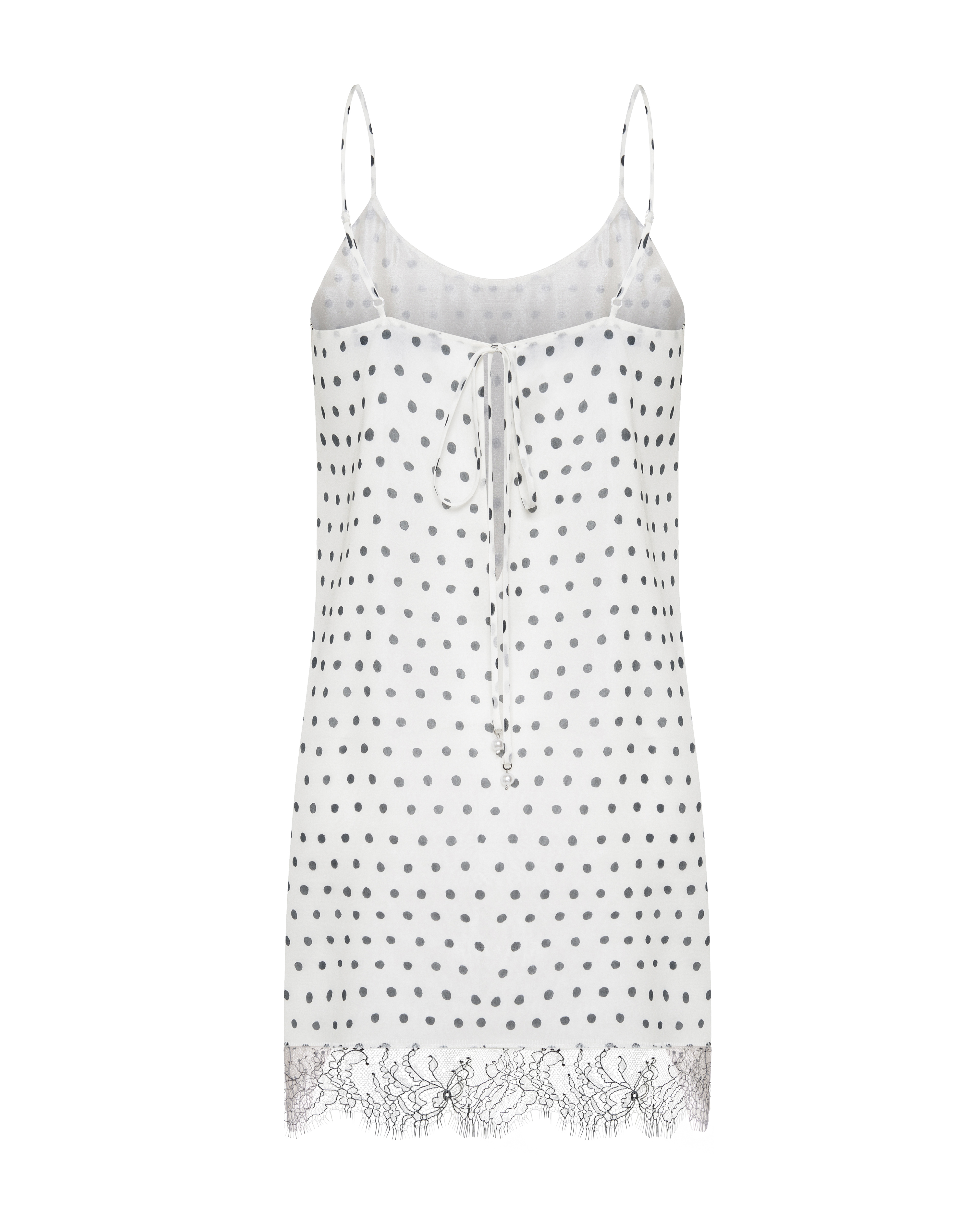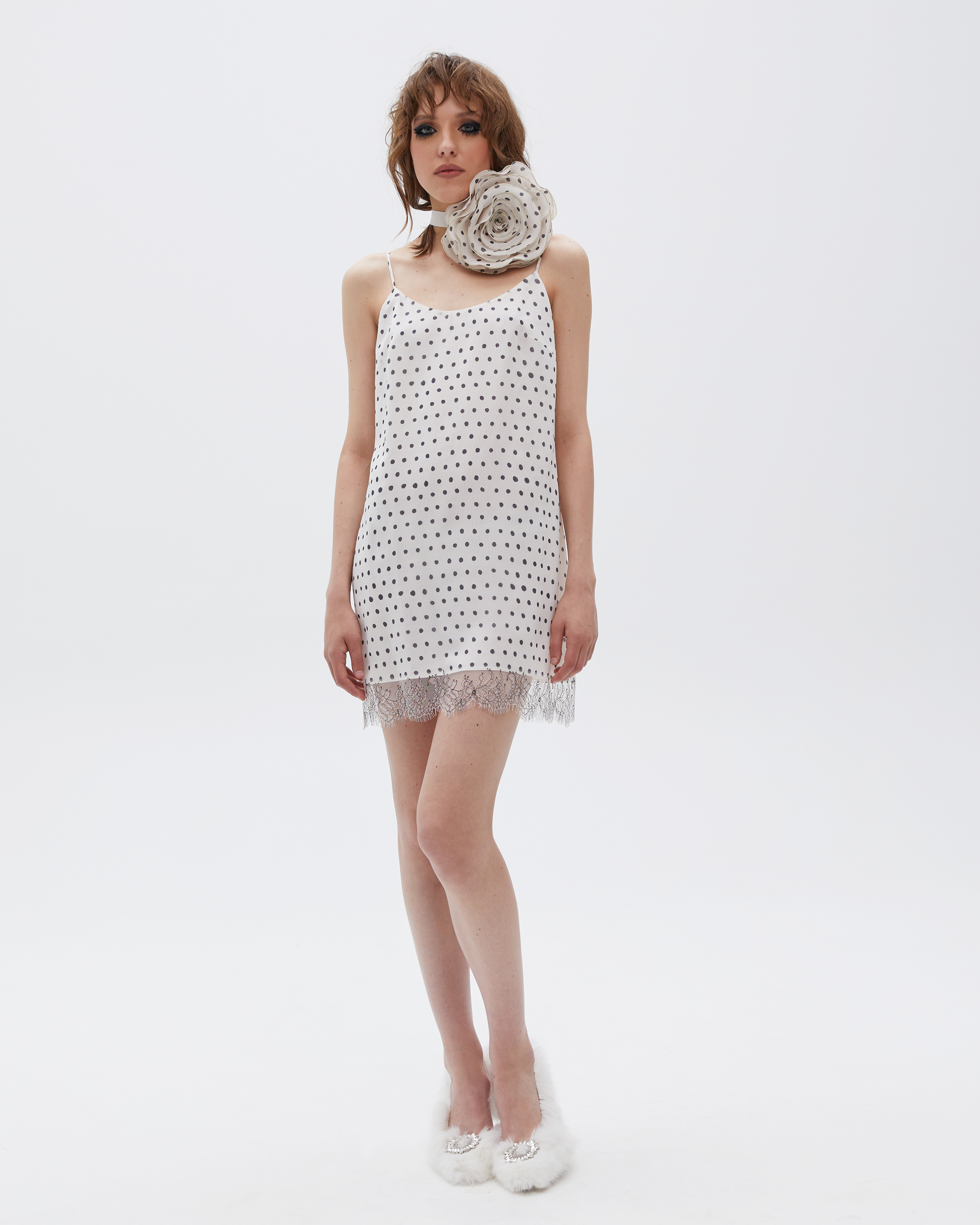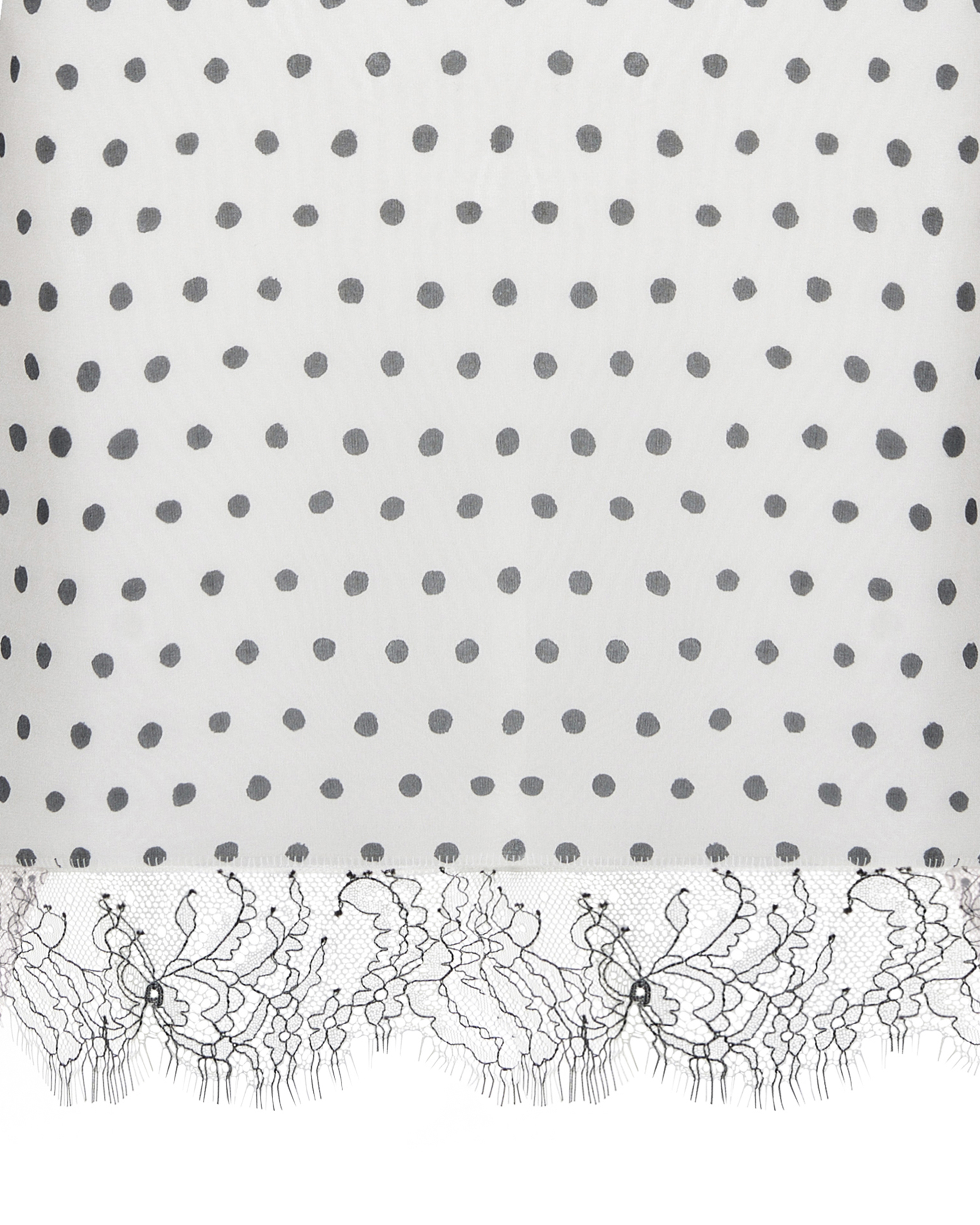 Двухслойное платье-комбинация прямого силуэта мини длины на регулируемых бретелях из итальянского полупрозрачного шелкового жоржетта в горох фабрики Clerici Tessuto на шелковом подкладе. Изделие дополнено отделкой из кружева, декоративными элементами из бусин и глубоким разрезом по спине.