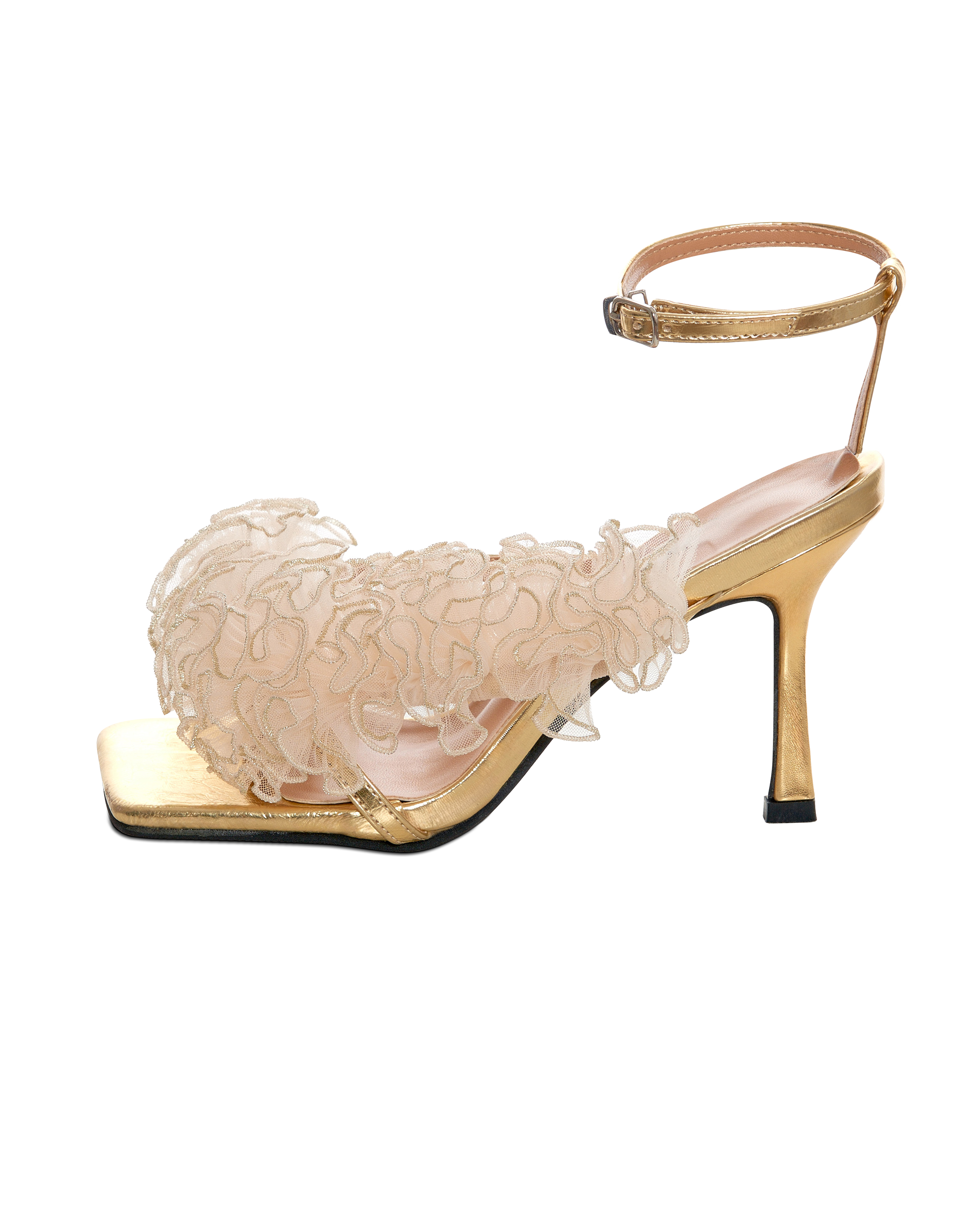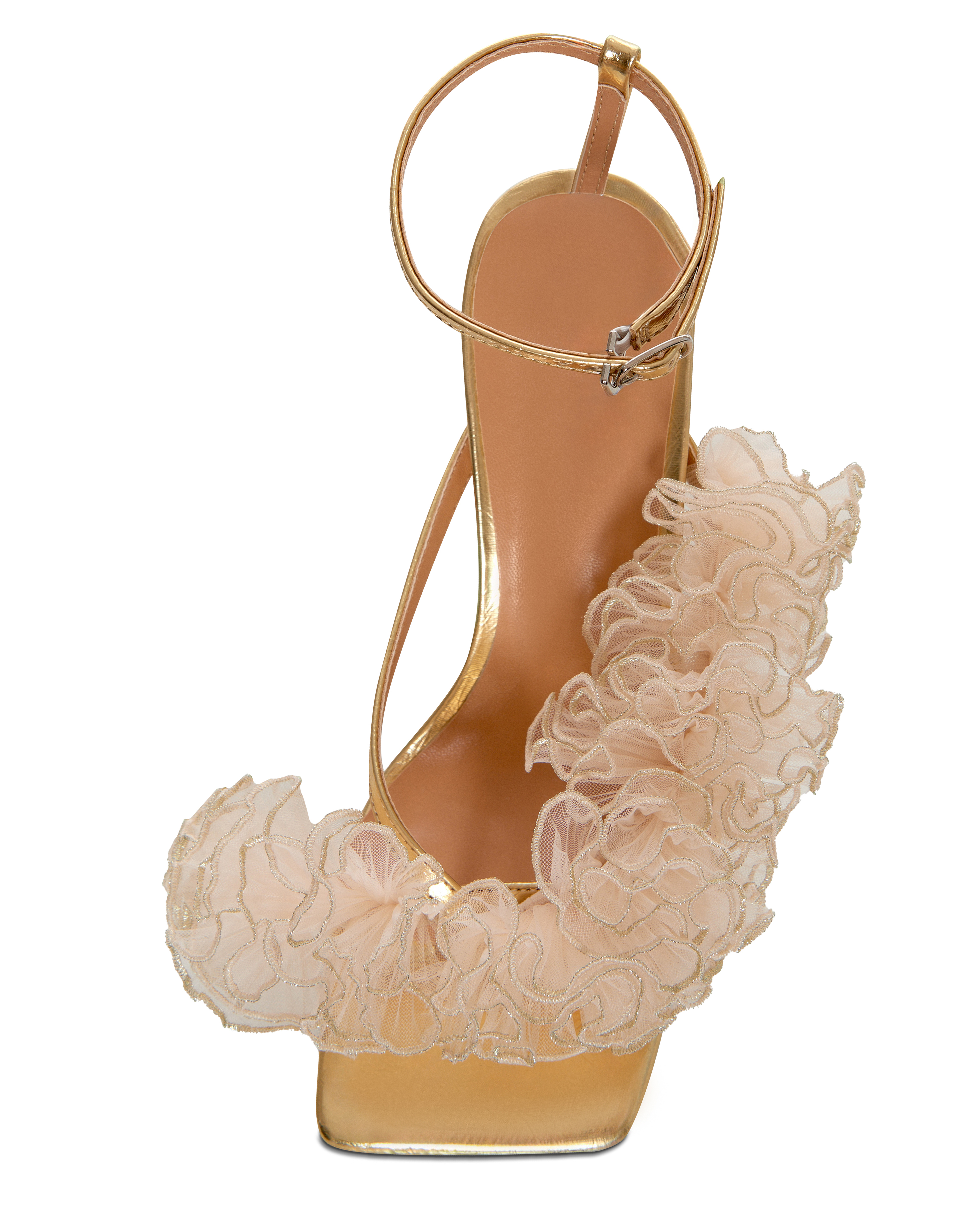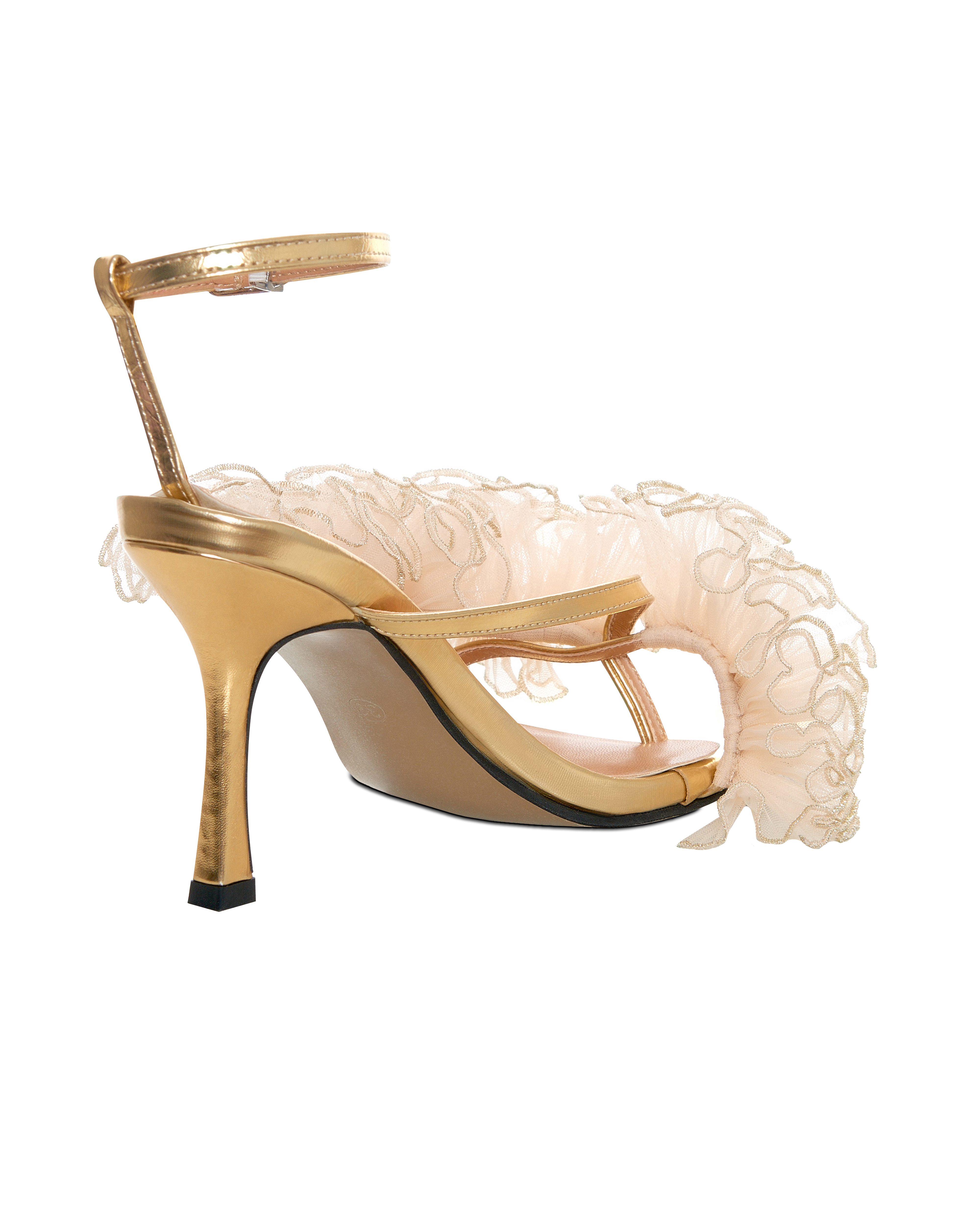 Верх декорирован плиссированной органзой с металлизированной нитью.