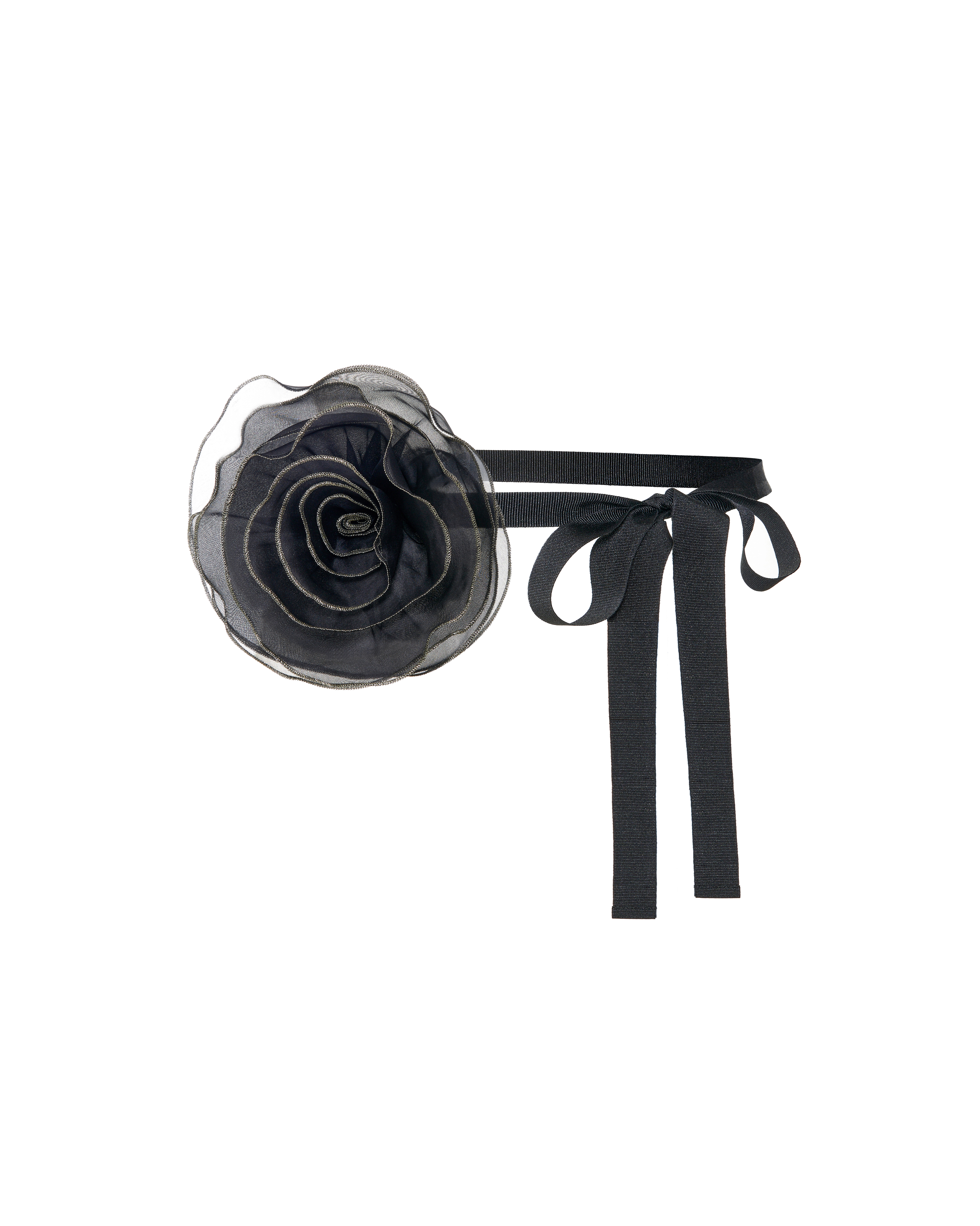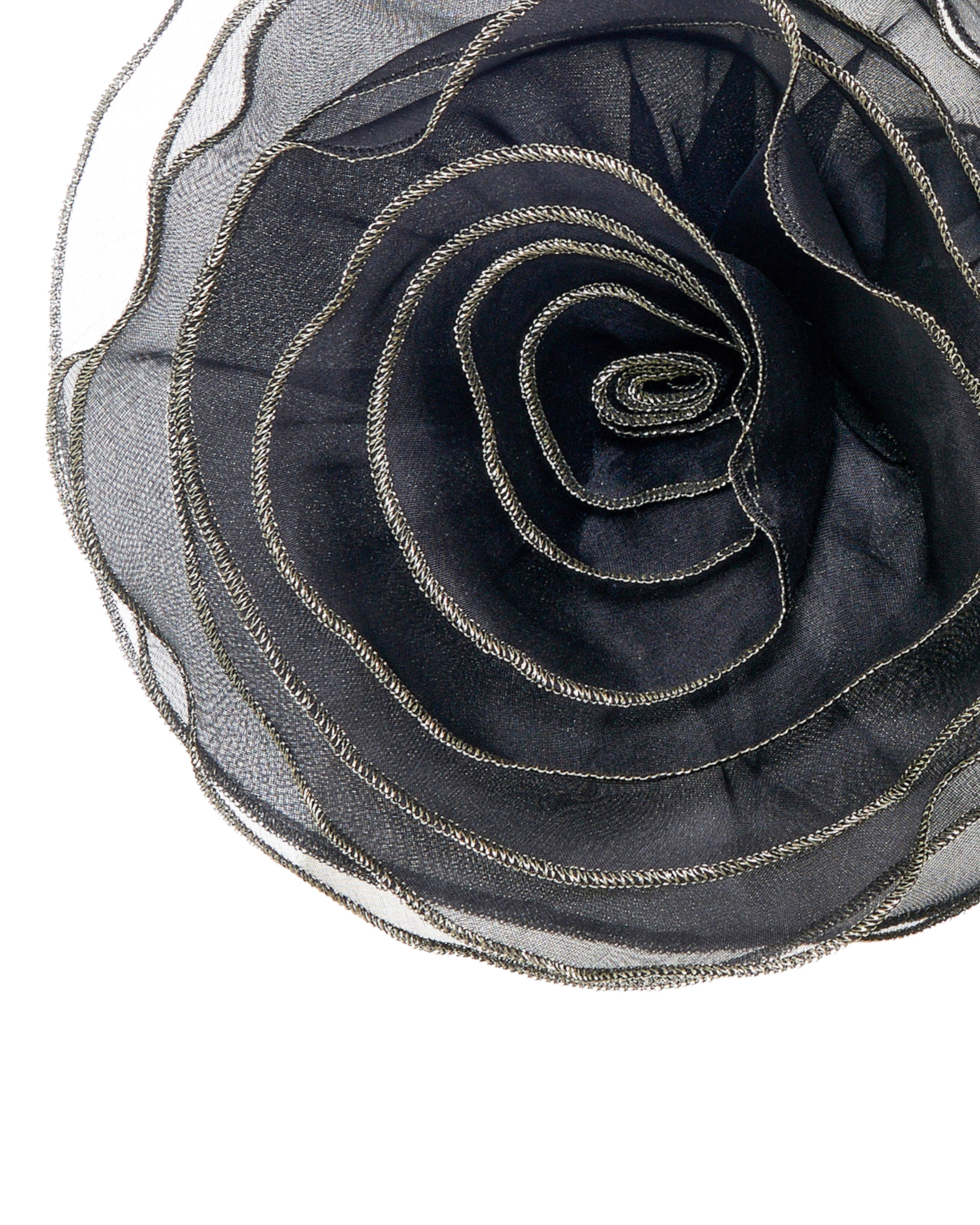 Брошь в виде объемного цветка из шелковой органзы с контрастной отделкой из металлизированной нитки на репсовой ленте. Возможно использовать как чокер, браслет, пояс или в классическом варианте: с помощью основы в виде булавки.