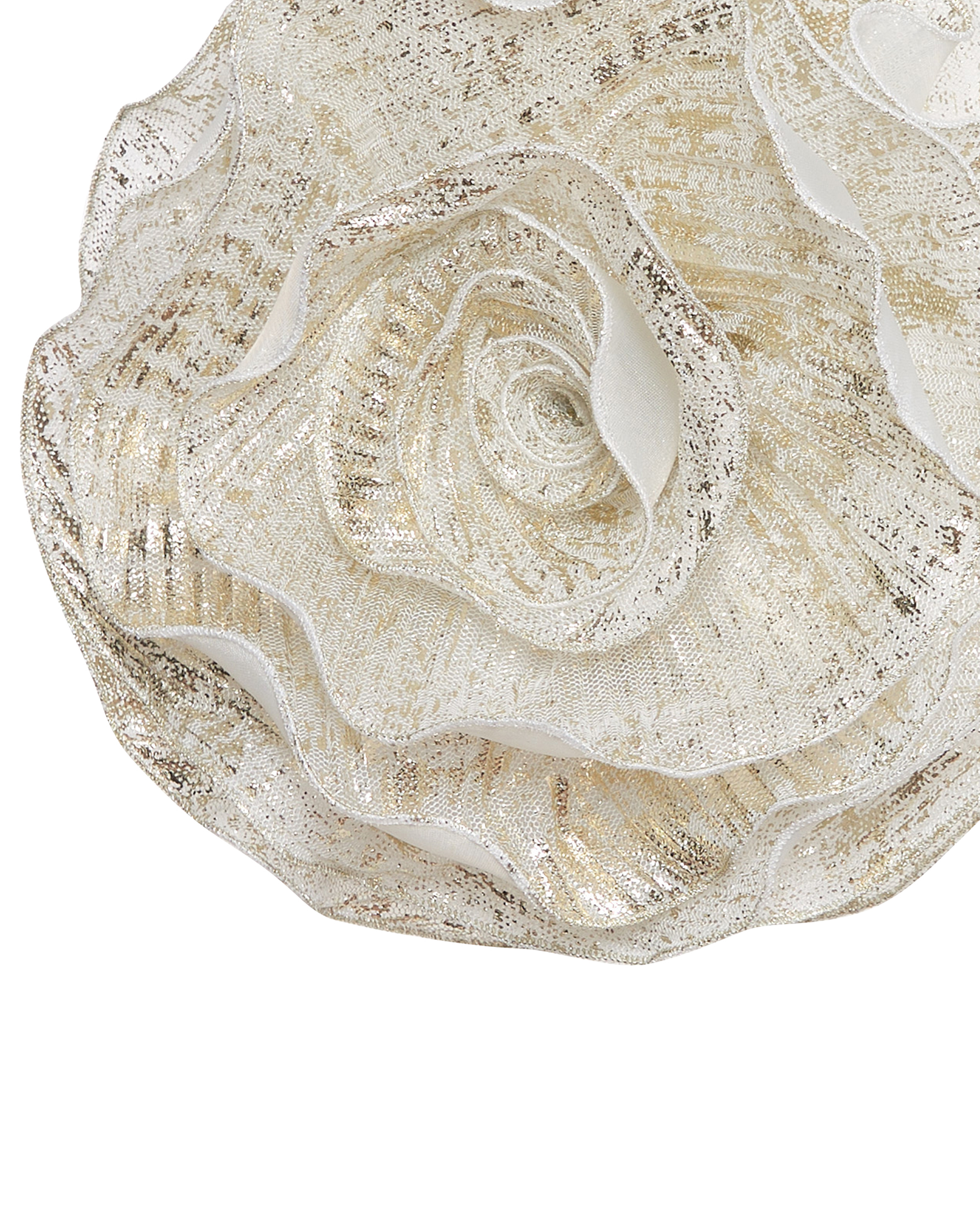 Брошь в виде объемного цветка из белого плиссированного фатина с золотистым напылением на репсовой ленте. Возможно использовать как чокер, браслет, пояс или в классическом варианте: с помощью основы в виде булавки.