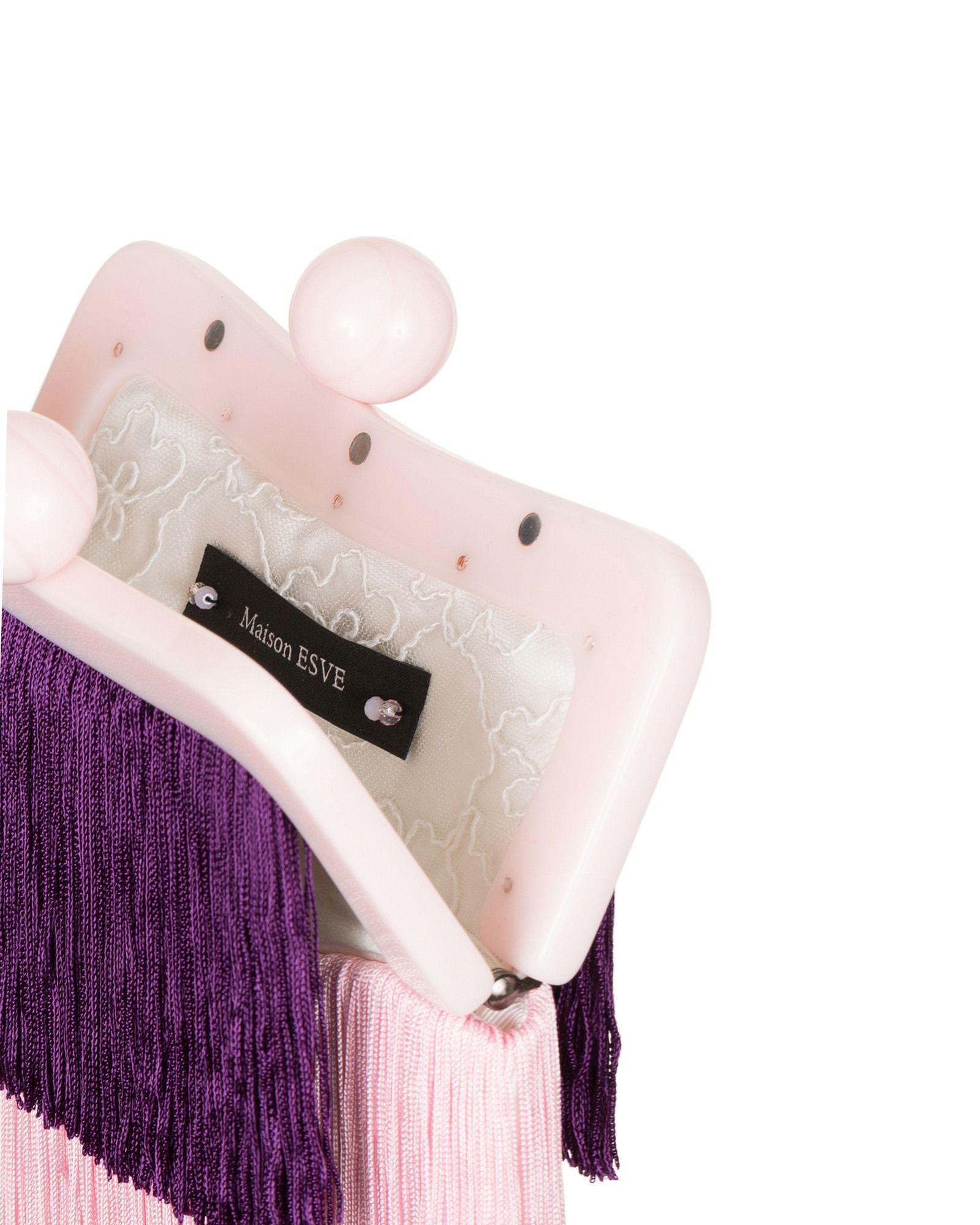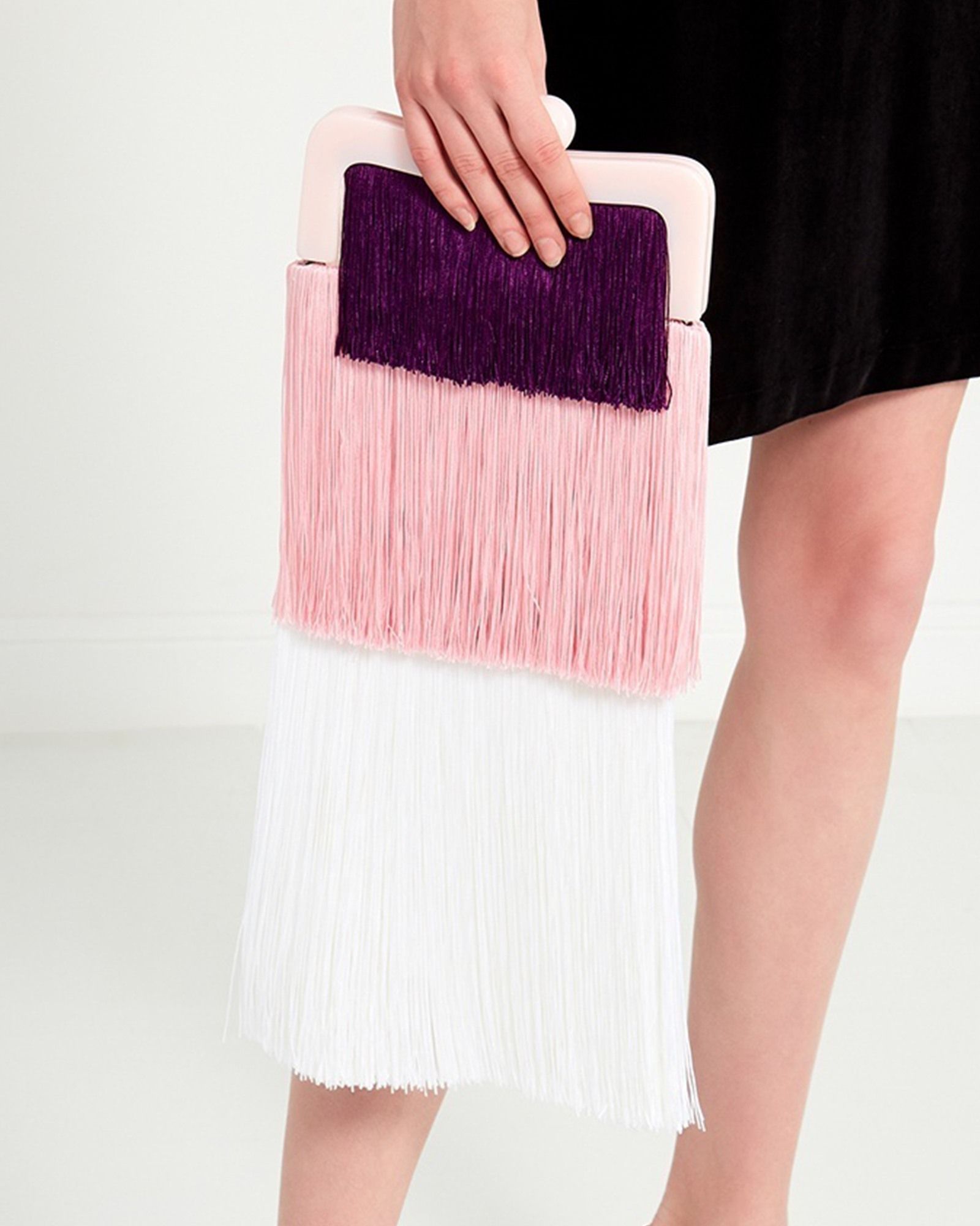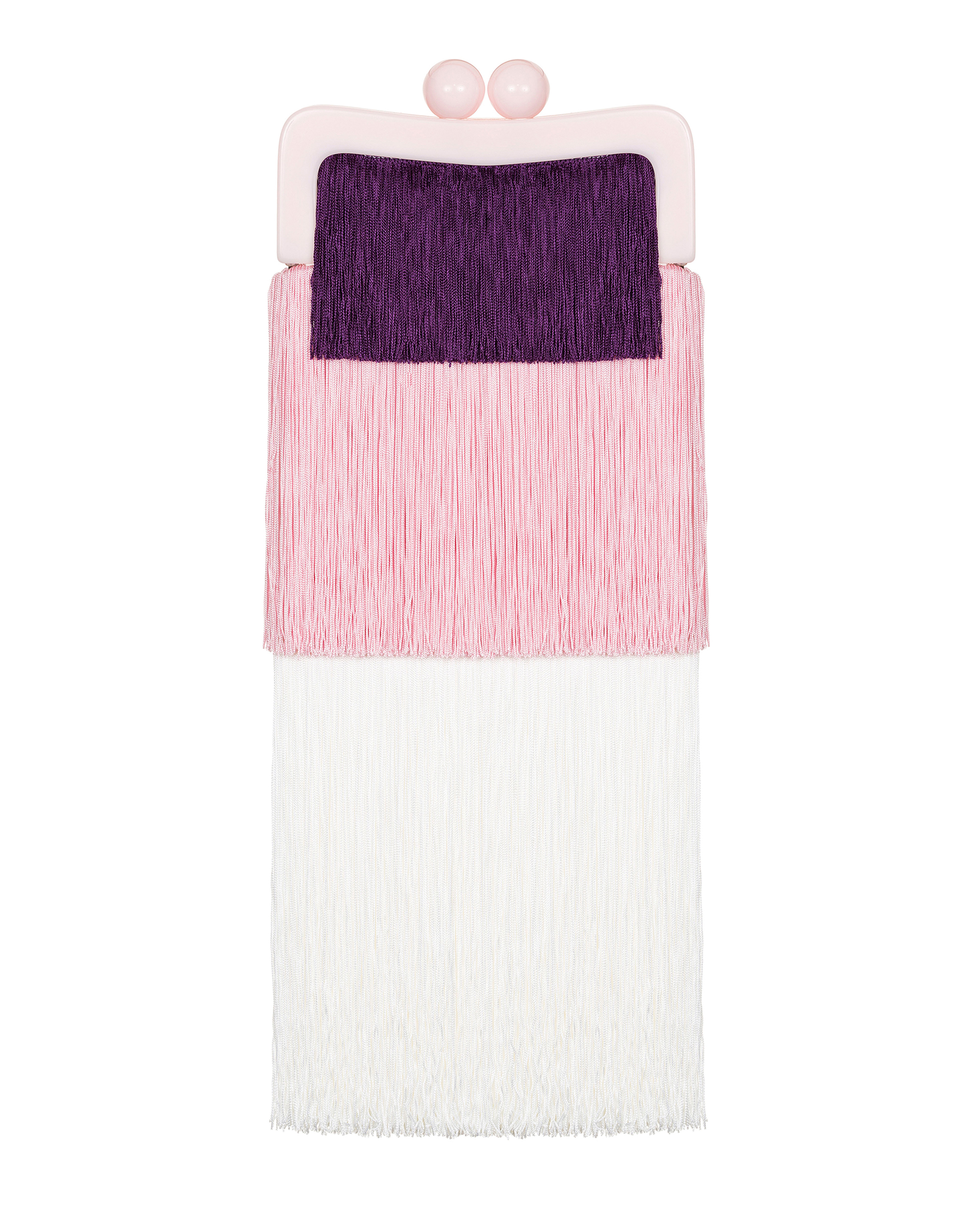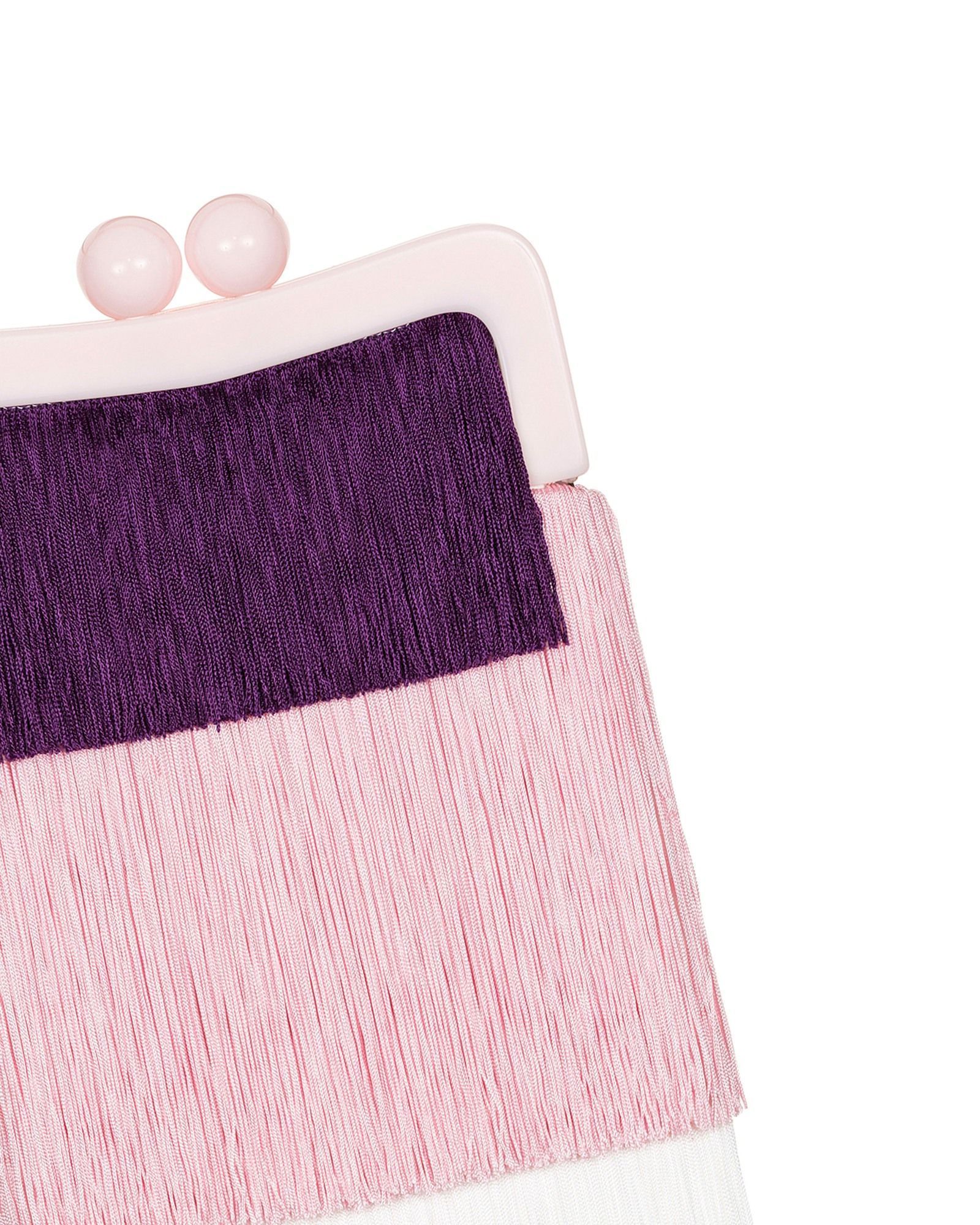 Удлиненный клатч из сложного сочетания разных оттенков бахромы ручной работы на пластиковом фермуаре. Подклад изготовлен из натурального шелка.